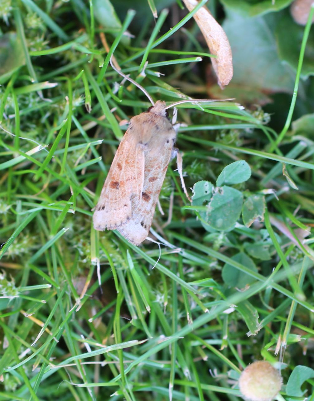 That characteristic common to many moths, the kidney mark, seems to be the main identification guide to distinguish the Brown-spot Pinion (Agrocholalitura), from the Beaded Chestnut. The moth in the photograph has a narrow kidney mark which, hopefully, points us in the right direction. An extremely active moth, it rushes in short bursts with its antennae waving vigorously.